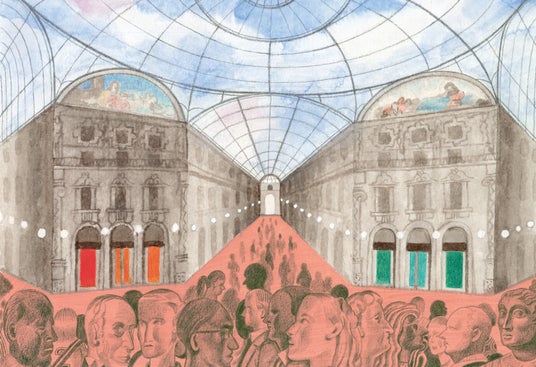 1978年パリ生まれのこのフランス人アーティストは、常にユニークかつ寛大な眼差しで世界を眺めてきました。アーティスト一家(母は教師兼画家、父はデザイナー兼彫刻家)で育った彼女は、パリのデュペレ応用美術学校でビジュアルコミュニケーションを学んだ後、将来夫となるジェイミー・ロックレイジ(Jamie Rocklage)と共に2003年にニューヨークへ移住しました。そこで「ファッション・フォトグラフィーの教祖的存在」であるスティーヴン・マイゼルとの人生を変える出逢いを経験。雑誌『Vogue』での2人の初となるコラボレーションはこの若い女性のキャリアにとって跳躍台の役目を果たし、主要な国際的出版物(『Vogue』、『The New Yorker』、『Vanity Fair』)で多数の特集が組まれました。2014年にフランスに戻った後、夫妻と娘(ほどなく息子も家族に加わる)はブリュッセルへ移り、2018年以来、アトミウム・エリアで暮らしています。メディア、出版、ファッションの世界でそれぞれに創造的エネルギーを発揮して足跡を残し、プラダのランウェイ(2014年春夏コレクション)でも、ジョーン・バエズの半生を描いた政治的なグラフィック・ノベル(Actes Sud Juenesse刊、2024年9月)のイラストでも同じように才能を発揮しています。「トラベルブック」の目的地を決める段になり、彼女にとってイタリアは自然な選択に思えました。それは、自分のルーツへの回帰(彼女の曽祖父母はトリノの北にあるフィオラーノ・カナヴェーゼの出身)であり、新しい風であり、「日常からの解放」、そして自らを刷新しうる、自分だけの時間と空間をなすものでした。彼女はミラノに魅了されました。それまではただ通り過ぎるだけだった都市が、今や、ファッションやデザイン、金融、アートの活気溢れる中心地であることが彼女にとって明らかになりました。彼女は単身あるいは姉妹や友人と連れ立って、合計5回、ミラノを訪れました。ミラノの雰囲気やパラッツォのコンクリートに当たる光に魅せられて以来、彼女はミラノの輝きを存分に浴び、隠れた奥深さを明らかにすると共に、絵葉書的なイメージよりも、街を活気付けているあらゆるディテールに意識を集中させました。彼女のスケッチブックは、解読の手掛かりとなるような無数のディテールを明らかにします。タペストリーのモチーフや看板のタイポグラフィー、そして、ドゥオーモ広場までずっと感じられる、ノヴェンチェント美術館(近代美術館)にあるマリノ・マリーニが彫刻した胸像群の消え去りがたい存在感を認識するのは読者にとっての喜びです。このアーティストは、ミラノでの体験を触れることのできるものにすべく努めました。彼女は、「自分の直感を貫く」ために、新しい技法を探り、雑然としていながらも楽しげに並び合うフォルムとスタイルで遊ぶことを自分に許しました。「ミラノは、中庭に面した格子や扉を、幾重にも重ね合わせたように感じられます」とデタランテは言います。「絶えずフレームが切り替わり、そのたびに謎が深まります。何が隠されているかをいつも知りたくなる」。それゆえ彼女は、作品に切り絵を含めて、それぞれのドローイングを別の現実で「補強」することにしました。彼女は、ジョルジョ・デ・キリコの形而上学の教えも、空間を照らすジョルジョ・モランディの光も、さらにはジオ・ポンティやエットレ・ソットサスといったデザインの巨匠たちの大胆さも決して忘れていません。同じ目的で、彼女は、フェルトペンや木炭、鉛筆などの繊細なテクニックを用いて、1980年代のフメット(イタリア漫画)にインスパイアされたコミックストリップのコマをグラフィックテーブルで描く時と同様の器用さで、素材やテクスチャーに命を吹き込みます。彼女の直感的な選択はすべて、単なる理解を超えたイタリアに対する造詣の深さや、予想外でありながら常に洗練されたグラフィックな偶然への情熱、さらには、大衆的なものとラグジュアリーなもの、よい趣味とそうでないものを分かつ境界の空間への情熱が滲み出ており、最終的には、いきいきとした美の形が浮かび上がります。