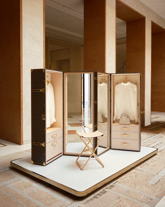 同時に、ルイ・ヴィトンはモンテナポレオーネ店において、「マル・クリエ ロジーヌ メゾン・ド・ファミーユ」を発表いたします。ステンドグラスのみで構成されたこのトランクは、メンズ クリエイティブ・ディレクター ファレル・ウィリアムスによる最新ファッションショーのために製作されたもの。本作は、「アート・オブ・ダイニング アニエール」コレクションと同様に、パリ近郊のアニエール・シュル・セーヌに佇むヴィトン家の邸宅が着想源です。歴史的なトランクアトリエを擁するこの邸宅の、近年修復されたステンドグラスに見られるアール・ヌーヴォー様式のフローラル・モチーフから直接インスピレーションを得ています。この特別なピースは、トランクの構造からガラス細工にいたるまで、極めて精緻なアトリエの専門技術を結集し、建築的かつ光を湛えたコンポジションとして構想。各要素が、卓越したサヴォアフェールを駆使して組み上げられ、伝統と革新の出逢いを体現しています。