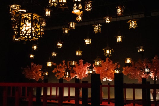 灯籠が連なるアーチ“銀座万灯籠”から、寺社建築に見られる回廊を表現した空間へ続く作品も、桜咲く春らしい景色となりました。