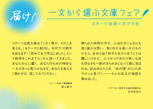 スターツ出版株式会社(本社:東京都中央区、代表取締役社長:菊地修一)は、株式会社ポプラ社(本社:東京都品川区:代表取締役 加藤裕樹)とのコラボレーション企画として「届け! 一文から選ぶ文庫フェア」を10月より全国書店で開催いたします。「スターツ出版文庫」と「ポプラ文庫」「ポプラ文庫ピュアフル」から10代に届けたい書籍を厳選!書店店頭でのフェアはもちろん、プレゼントキャンペーンも出版社合同で行う予定です。
