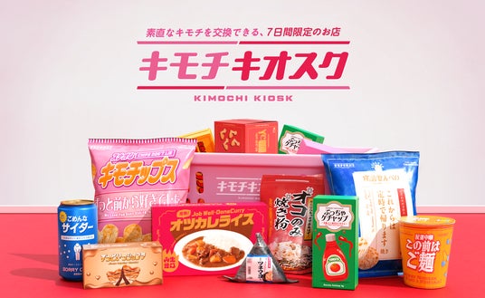 キモチキオスクは、伝えたかった素直なキモチを交換できる、7日間限定の体験型展示です。コンビニエンスストアのような空間で、来場者は自分の気持ちを表す商品を棚から探し出します。タイミングを逃した感謝やちょっとした賞賛、お節介なアドバイス、直してほしい癖、いまさら伝えづらい謝罪など、ユーモアとアソビゴコロ溢れる体験を通じて、お互いの気持ちや感情を改めて知り合うことができる展示です。