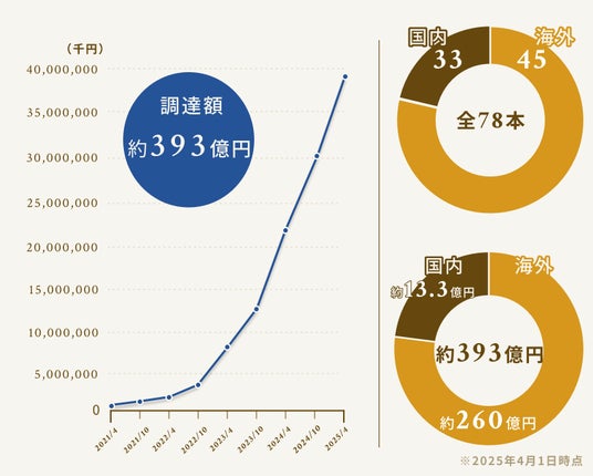 リリース後1年で累計調達額25億円、2年で80億円、3年で200億円を達成しました。2025年4月時点において、累計78ファンドにおける調達金額は393億円と400億目前にまで至っています。