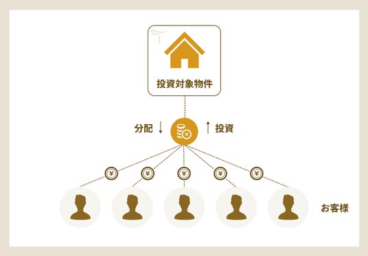 複数の投資家様から出資を受けた金銭により不動産を取得し、運用期間中の賃貸収入や売却時の利益を分配する仕組みです。なお、不動産特定共同事業法(国土交通省所管)に基づき、投資家のみなさまに安心してご利用いただける透明性の高いサービスを目指しております。