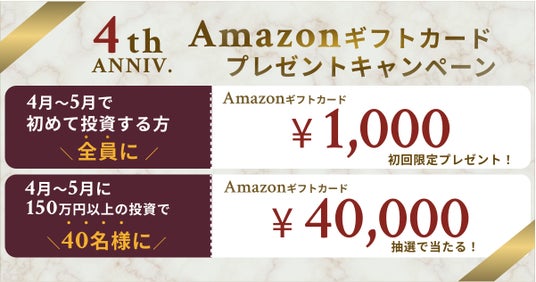 4月~5月に募集するファンドへ、1ファンドにつき150万円以上ご投資いただいた投資家の皆様の中から、抽選で40名様にAmazonギフトカード4万円をプレゼント