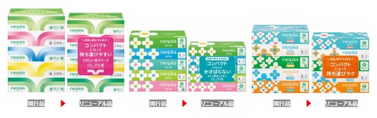 2025年3月より、ティシュの枚数や厚みといった品質はそのまま、箱の高さと奥行きを縮小する「コンパクト化」を実施し、より持ち運びに便利で、環境負荷を低減した商品へとリニューアルしました。
