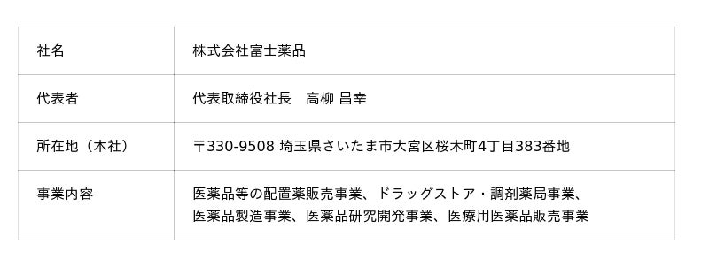 富士薬品は、1930 年富山県富山市における配置薬販売業の創業からスタートし、現在では配置薬販売事業に加えて、ドラッグストア・調剤薬局事業、医薬品製造事業、医薬品研究開発事業、医療用医薬品販売事業を展開する複合型医薬品企業です。スローガン「とどけ、元気。つづけ、元気。」のもと、富士薬品グループ全体で日本全国に1,273 店(2025 年3月末時点)を展開する「セイムス」ブランドを中心としたドラッグストアと、全国に広がるラストワンマイルを埋める配置薬販売ネットワークを生かし、誰もが豊かな人生を送れる社会の実現に向けて、人々の暮らしのあらゆる場面で寄り添い、元気な生活を支え続けてまいります。【株式会社富士薬品 会社概要】 URL:https://www.fujiyakuhin.co.jp