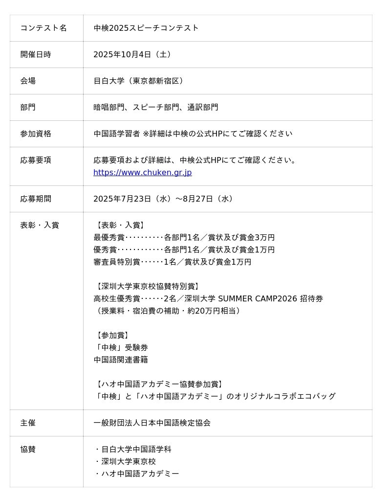 株式会社イーオン(本社:東京都新宿区、代表取締役社長:重野卓、以下「イーオン」)が運営するハオ中国語アカデミーは、一般財団法人 日本中国語検定協会(所在地:東京都中央区、理事長:内田慶市、以下「中検」)が2025年10月4日(土)に開催する「中検2025スピーチコンテスト」に協賛をいたします。