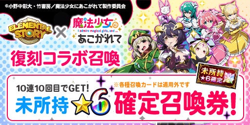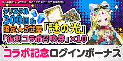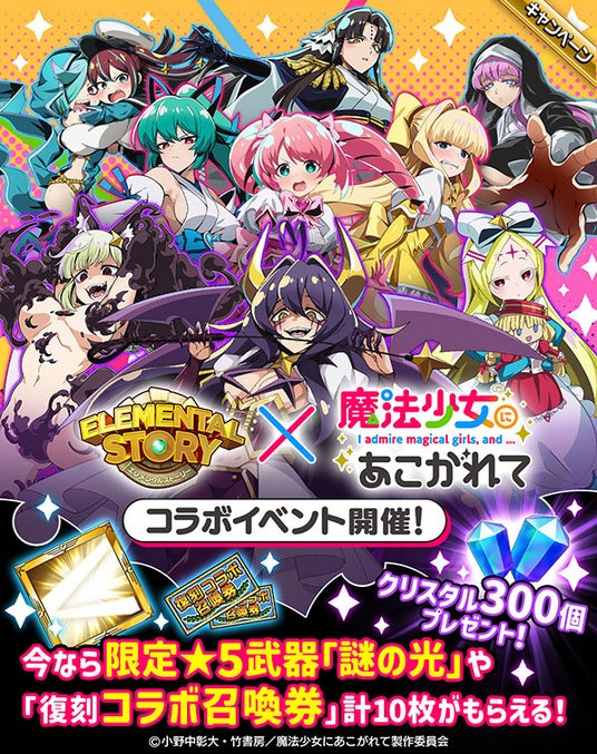 エレメンタルストーリーがアニメ『魔法少女にあこがれて』と二度目のコラボ!ログインボーナスでクリスタル300個や武器「★5 謎の光」、「復刻コラボ召喚券」を最大10枚GETしよう!
