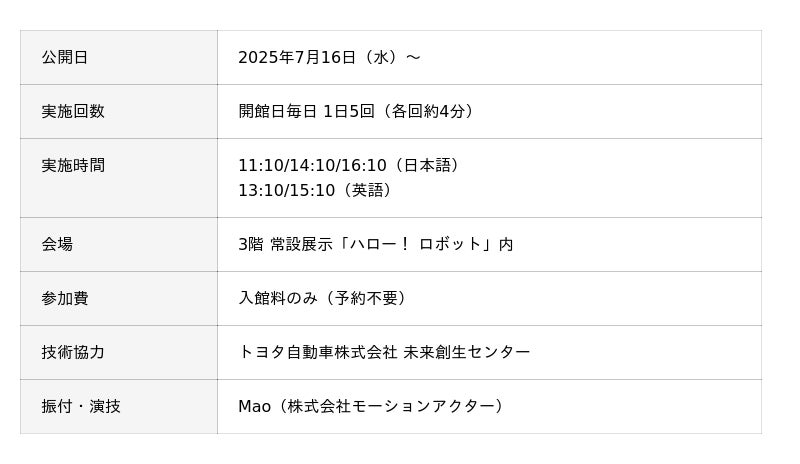 日本科学未来館(略称:未来館 館長:浅川智恵子)は、オリジナルパートナーロボット「ケパラン」の新実演「ケパラン音頭」を2025年7月16日(水)から開始します。また8月には、ケパランを実際に動かすことができるプログラミング・ワークショップも開催。ケパラン初のオリジナルグッズの販売も決定しました。今年の夏は未来館で、ケパランと一緒に踊ったり、自由に動かしたりする体験を通して、人とロボットがともに暮らす未来を楽しく想像してみましょう。