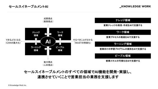 ナレッジワークは、現場で働く一人ひとりのイネーブルメント(成果創出や能力向上)の実現を掲げ、「ナレッジ」「ワーク」「ラーニング」「ピープル」の4領域でマルチプロダクトを展開・拡充しています。営業領域では、これまで蓄積してきたイネーブルメントメソッドとデータをもとに、営業担当者の様々な仕事を自律的に支援を行うセールスAIエージェントの開発を進めております。