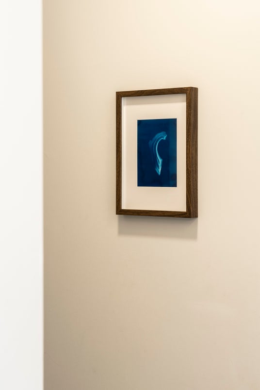 最新作のサイアノタイプ(日光写真)のシリーズは作家が「大村焼の耳」と呼ぶ、陶器を鋳込むときにできる端材から制作された。京都にある耳塚とも呼応しながら、どこか不鮮明に現れる青写真のモチーフは、境界をはみ出た人々、あるいは歴史からこぼれ落ちた人々が現代の声を聞く、耳のようにも見ることができる。