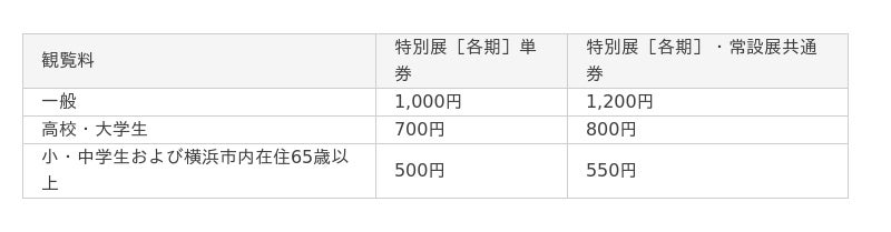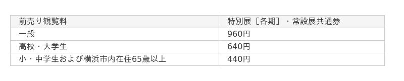【観覧料】 一般1,000円、高校・大学生700円、小・中学生および横浜市内在住65歳以上500円(特別展のみ)