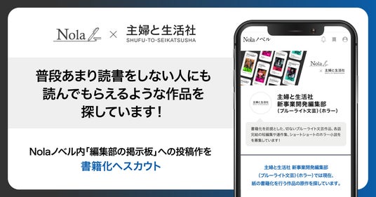 50万人を超える作家の皆さまが登録する創作プラットフォーム「Nola(ノラ)※1」を提供する株式会社indent(本社:東京都千代田区、代表取締役社長:釜形 勇気、以下「indent」)は、株式会社主婦と生活社(本社:東京都中央区、代表取締役社長:高納 勝寿、以下「主婦と生活社」)と、2月25日(火)より、indentが運営する小説投稿サイト「Nolaノベル」内「編集部の掲示板」に「主婦と生活社_新事業開発編集部」の原作募集ページを開設し、「ブルーライト文芸」と「ホラー」の2ジャンルのスカウトを開始いたしますことをお知らせいたします。