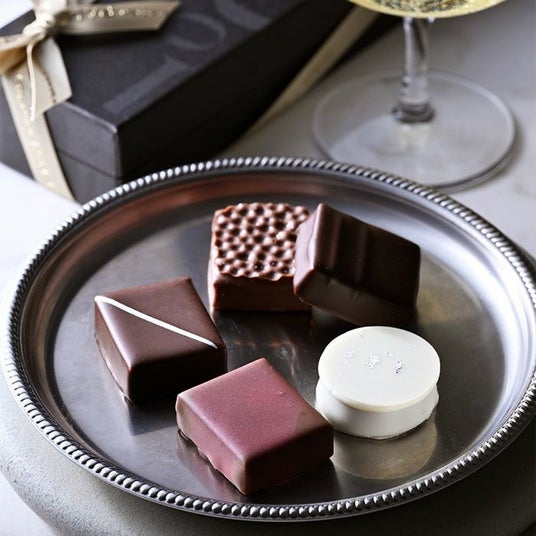 一流のお酒とチョコレートで作った贅沢なコレクション獺祭スパークリングやドンペリなど、それぞれ贅沢なお酒を使ったボンボンショコラ。カカオ豆から手がける自家製ショコラをベースに、ときにフルーティに、はたまた力強く、お酒と奏でる芳醇なハーモニーはどれも白眉だ。口どけも品があり、1粒1粒の完成度に感嘆!