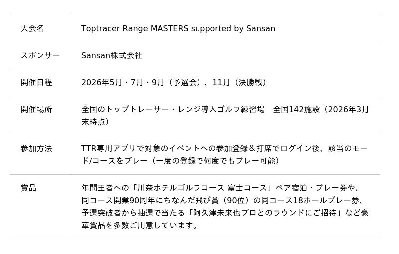 初開催となった昨年は、全国のゴルファーに新たなプレースタイルを提供し、大好評のうちに幕を閉じました。2年目となる本大会はSansan株式会社をスポンサーに迎え、全国(2026年4月時点:142施設)の「Toptracer Range(トップトレーサー・レンジ、以下「TTR」)」導入施設で予選を実施。11月の決勝大会では、日本を代表する名門ゴルフコースである「川奈ホテルゴルフコース 富士コース」(静岡県伊東市川奈)をバーチャルラウンドの舞台として王座を争います。
