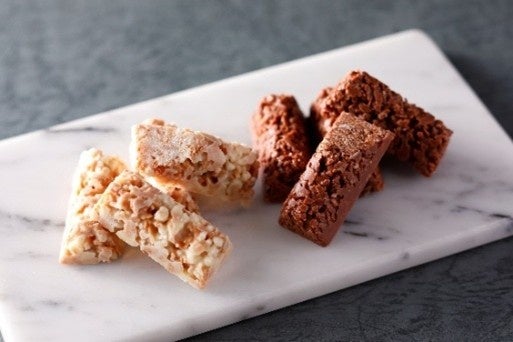 口どけの良いチョコレートに練り込んだ、砕いたフイユティーヌ、クッキーなどが、さくさくと浮き立つような食感を演出します。フレーバーはやさしい味わいのオレ、ミルキーな香りとまろやかなコクが特長のブランの2種類です。