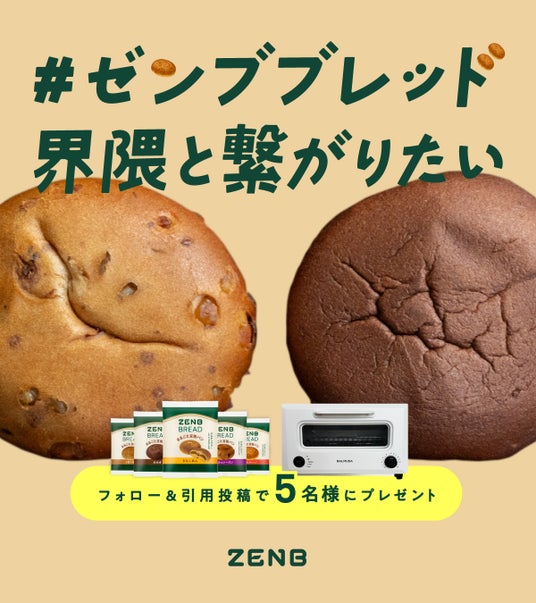 株式会社ZENB JAPAN(ゼンブ ジャパン)(愛知県半田市、以下ZENB)は、ブランド誕生から6周年の感謝を込めて、人気商品「ZENBブレッド」の魅力をみんなでシェアするSNSキャンペーンをX、Instagramのそれぞれで、2025年3月19日(水)から4月6日(日)まで開催します。合計10名に、「ZENBブレッド」5種の詰め合わせと、豆粉パンがおいしく焼き上がる「BALMUDA(以下 バルミューダ)」トースターのセットをプレゼントします。