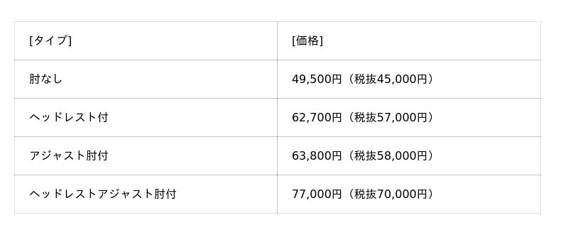 ラインアップは、ヘッドレストとアジャスト肘の有無で全4タイプ。本体カラーはブラックで、クロスカラーは落ち着いたトーンで多様なオフィス空間に調和する6色展開です。価格(税込)は、肘なし49,500円、ヘッドレスト付62,700円、アジャスト肘付63,800円、ヘッドレストアジャスト肘付が77,000円です。