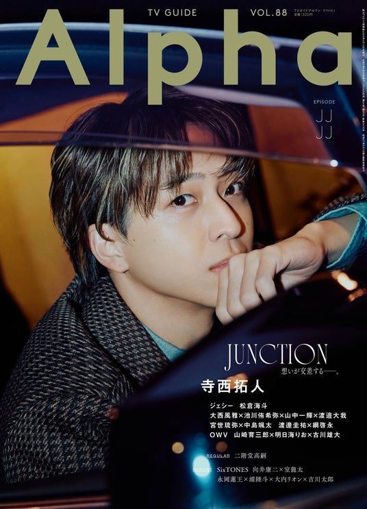 写真集のようなビッグサイズの判型が特徴的な「TVガイドAlpha」は、アルファベットの頭文字(A~Z)をテーマに、今の時代を象徴する旬な人やグループの核心に迫るシリーズ。今回の「EPISODE JJJJ (クワトロジェイ)」には、寺西拓人が表紙に登場します。