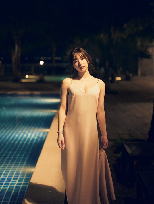 今回は3度目の重版を記念し、写真集の中から新たなカットを公開。ピンクベージュのヌーディーなロングワンピースを着て夜のプールサイドに佇む、儚げな1枚となっている。