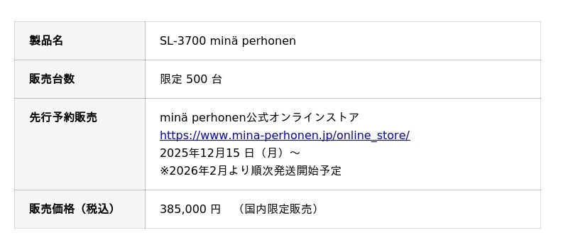 JUKI株式会社(本社:東京都多摩市、以下「JUKI」)は、ブランド「ミナ ペルホネン(mina perhonen)」とコラボレーションした職業用本縫いミシン「SL-3700 mina perhonen」を、500台限定で発売いたします。12月15日(月)より、ミナ ペルホネンのオンラインストアにて予約販売を開始いたします。