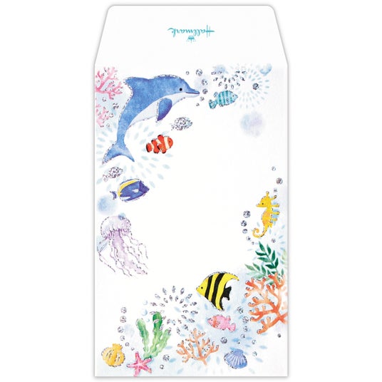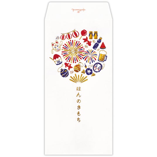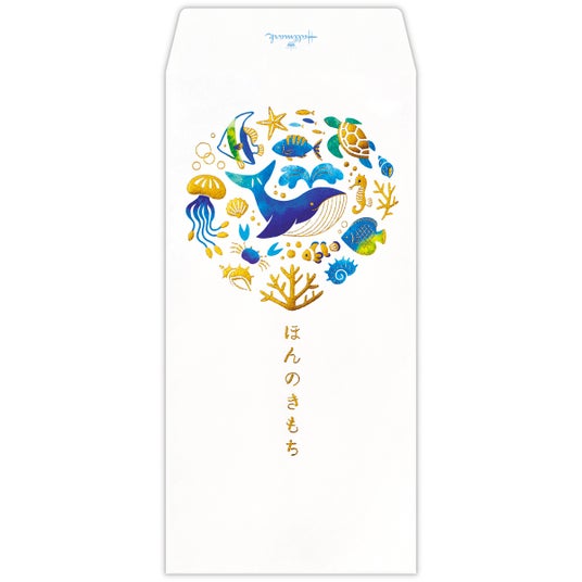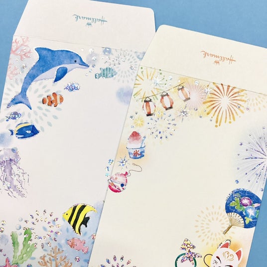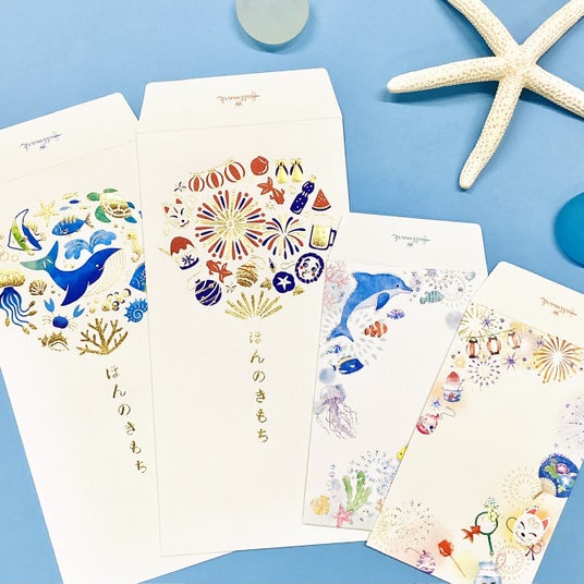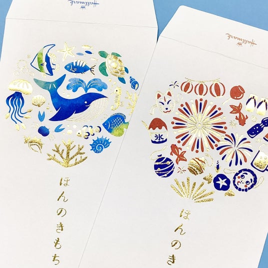 お子様に渡す用から大人同士のお付き合いにも使えるお札が入るサイズのポチ袋。クジラやクラゲなど海のいきものを描いた柄と、金魚やヨーヨーなどお祭りの定番モチーフが描かれた柄の2種類。よく見ると絵柄とセンチメントのレイアウトがうちわの形になっている遊び心あふれるデザインです。金箔加工入り。
