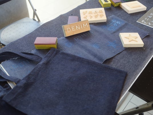 国産デニムの歴史やデニム生産日本一の広島県福山市のものづくりの背景を楽しく学びながら、色落ちするデニムの特性を活かしてオリジナルのトートバッグを作ります。