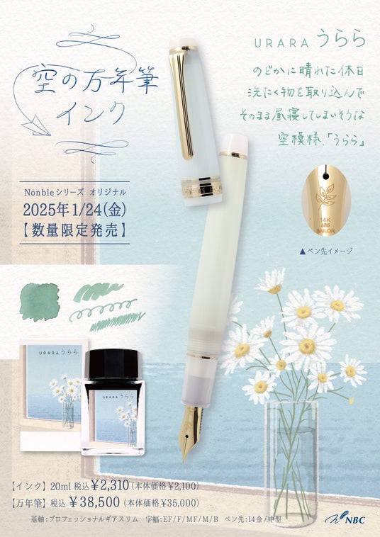 文具卸・店舗運営の株式会社エヌ・ビー・シー(本社東京都目黒区 / 代表取締役社長 丸山裕子、以下エヌ・ビー・シー)のオリジナルブランドNONBLEから、『空』をテーマにした万年筆&インクの第四弾「うらら」が数量限定で登場。1月24日(金)より販売開始。なお、販売店については当社HPにて詳細を記載しております。