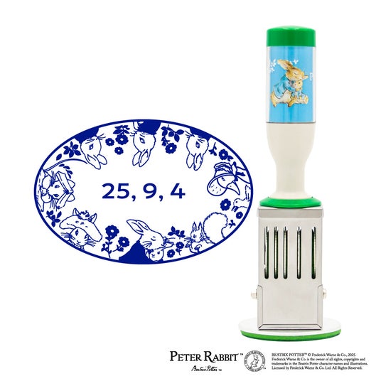 ピーターラビットのかわいいキャラクターたちがデザインされた小判型の日付印です。