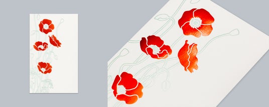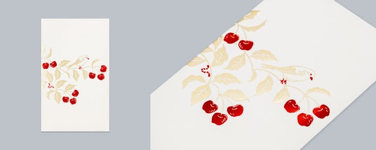 箔押し加工とは熱と圧力によって、紙に箔を圧着させる技法です。浮世絵の木版画を刷り上げていくように、1枚ずつ金属板をつくり、2度3度と箔を重ねて絵柄を完成させていきます。