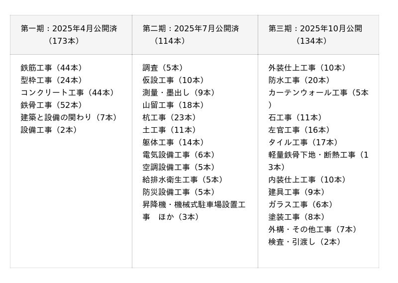 今回の第三期では、第一期(2025年4月公開:躯体工事・一部設備工事など/全173本)、第二期(2025年7月公開:仮設・山留・杭・土工事・各設備工事など/全114本)に続き、下記の工種・工程を対象とした新たな134本の教育動画を追加。建設現場で必要な実務知識を体系的かつ短時間で習得可能な内容へと拡充しています。