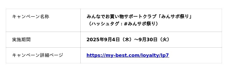 商品比較サービス「マイベスト」を運営する、株式会社マイベスト(本社:東京都中央区、代表取締役CEO:吉川 徹、以下マイベスト)は、ユーザー参加型のクチコミプログラム「みんなでお買い物サポートクラブ」(以下みんサポ)にて、総額1,200万円分以上のポイントバックを行うキャンペーン「みんサポ祭り」を、2025年9月4日より開始いたします。