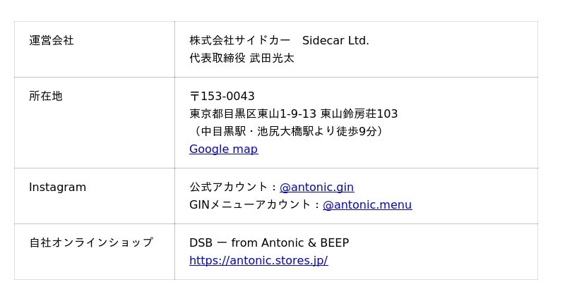 中目黒のジントニック専門店 The World Gin&Tonic〔Antonic〕(ザ ワールドジンアンドトニック アントニック)を運営する株式会社サイドカー(本社:東京都目黒区、代表取締役:武田光太)。