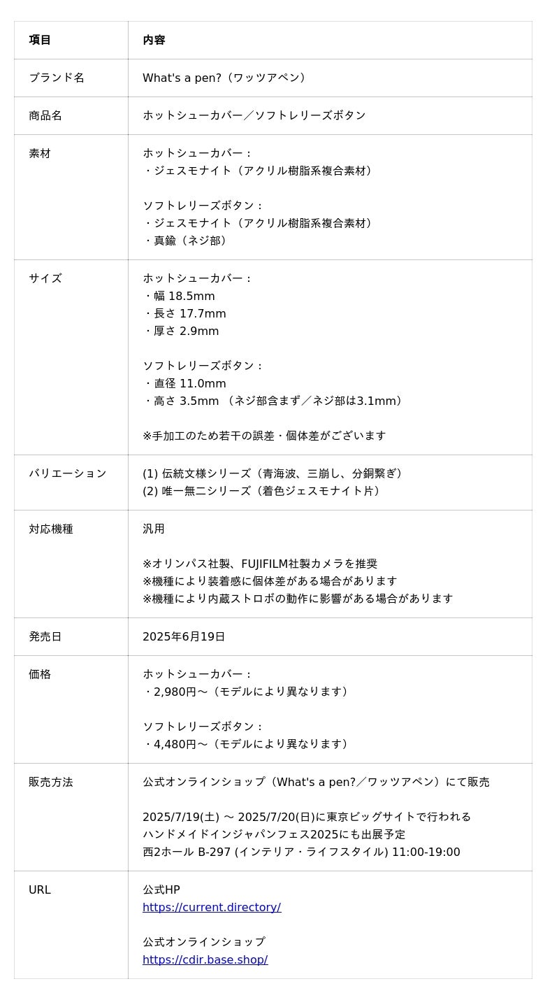2025年6月19日、合同会社カレントディレクトリ(東京都渋谷区)は、ホットシューカバーとソフトレリーズボタンをリリースします。公式オンラインショップ(What's a pen?/ワッツアペン)にて購入できます。