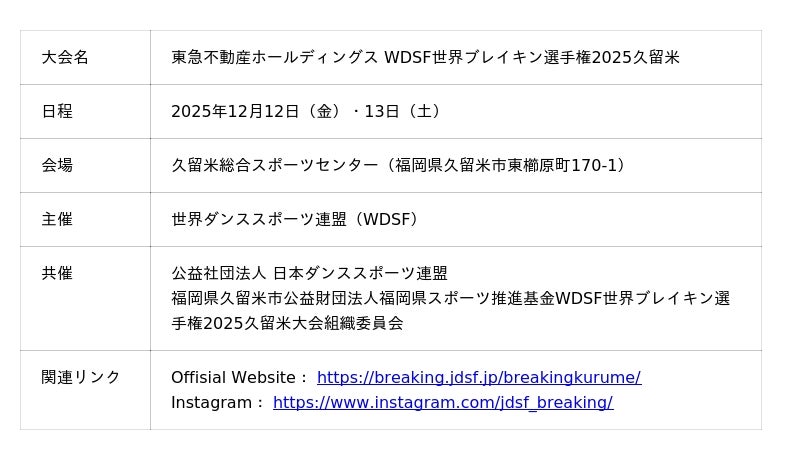 公益社団法人日本ダンススポーツ連盟 ブレイクダンス本部は、2025年12月に久留米市で開催される「東急不動産ホールディングス WDSF世界ブレイキン選手権2025久留米」において、地元・久留米を代表するダンスクルー「九州男児新鮮組」が公式ダンスクルーアンバサダーに就任したことをお知らせいたします。