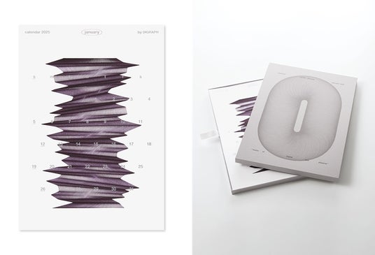 クリエイティブスタジオDIGRAPHでは、デジタルと物理の融合をテーマに、プロッターを使った偶発的表現とシルバー箔押しを組み合わせた斬新なカレンダーを制作しています。新たなグラフィック表現への挑戦が際立つデザインが特徴です。