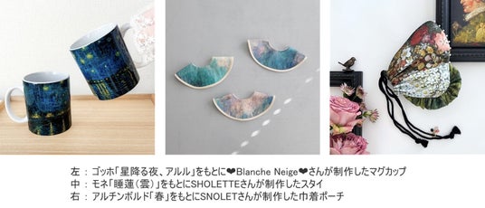 モネの「睡蓮」やゴッホの「星降る夜、アルル」等の有名絵画の画像データを使用するなど、多彩なアートから影響を受けた作品を販売します。通常は「minne byGMOペパボ」限定で販売される作品を、来場者が実際に手に取ってご覧いただける貴重な機会です。