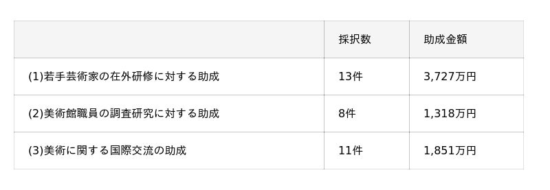 ※若手芸術家の在外研修に対する助成事業とは、40歳未満のアーティストを対象に海外での研修を援助し、更に活発な創作活動を奨励しようとするものです。