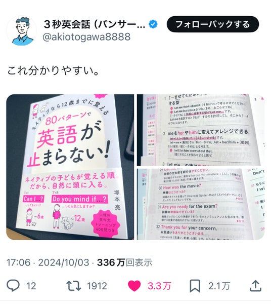 X(旧Twitter)英語インフルエンサーの3秒英会話(パンサー戸川)氏(@akiotogawa8888)が「これ分かりやすい。」と紹介した投稿は336万回インプレッションを超え、「これ、いいですよね!」や「私も持っています」のコメントが相次ぎました。