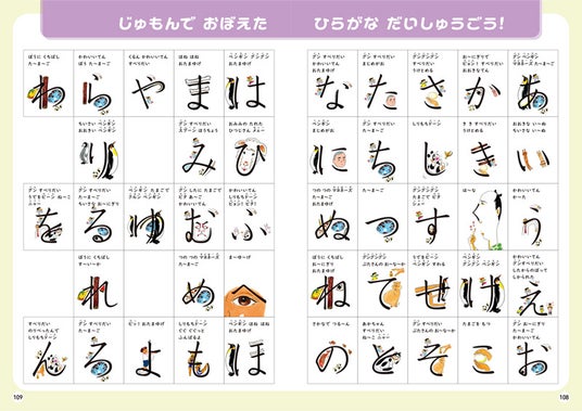 1万人以上の子どもたちが笑いながらひらがなを覚えた“じゅもん”を見開き1ページで見ることができます。