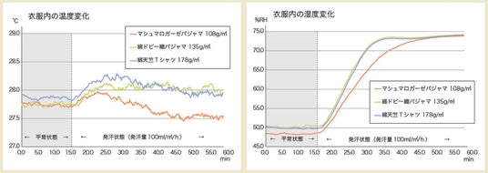 就寝中に「ムレ感」や「ベタつき」によって目が覚めてしまった・・・という経験がある方は多いのではないでしょうか。この「ムレ感」や「ベタつき」の要因となりえるのは、肌とパジャマの間の温度と湿度。下記のデータは、異なる3種類の素材を使用し、発汗状態の衣服内の温度と湿度を計測した結果です。このようにマシュマロガーゼは、他素材よりも温度と湿度の上昇が抑えられ、心地よい睡眠をサポートしていることが分かりました。