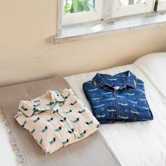 ベージュ地にはおしゃれに着飾ったダックスフントを、ダークブルー地にはワニをデザインした遊び心のあるパジャマです。キッズサイズもあるので、家族で揃えると楽しいひとときをお過ごしいただけます。