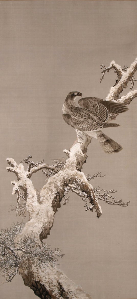 刺繍《雪中蒼鷹図》 原画:竹内 栖鳳 / 刺繍:未詳 1894年頃 京都国立近代美術館蔵 【III部展示】 Photo:木村 羊一