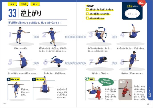 - レベル別でやさしい動きからスタート。逆上がり・開脚跳び・側転も解説。体育の授業でもう困らない!