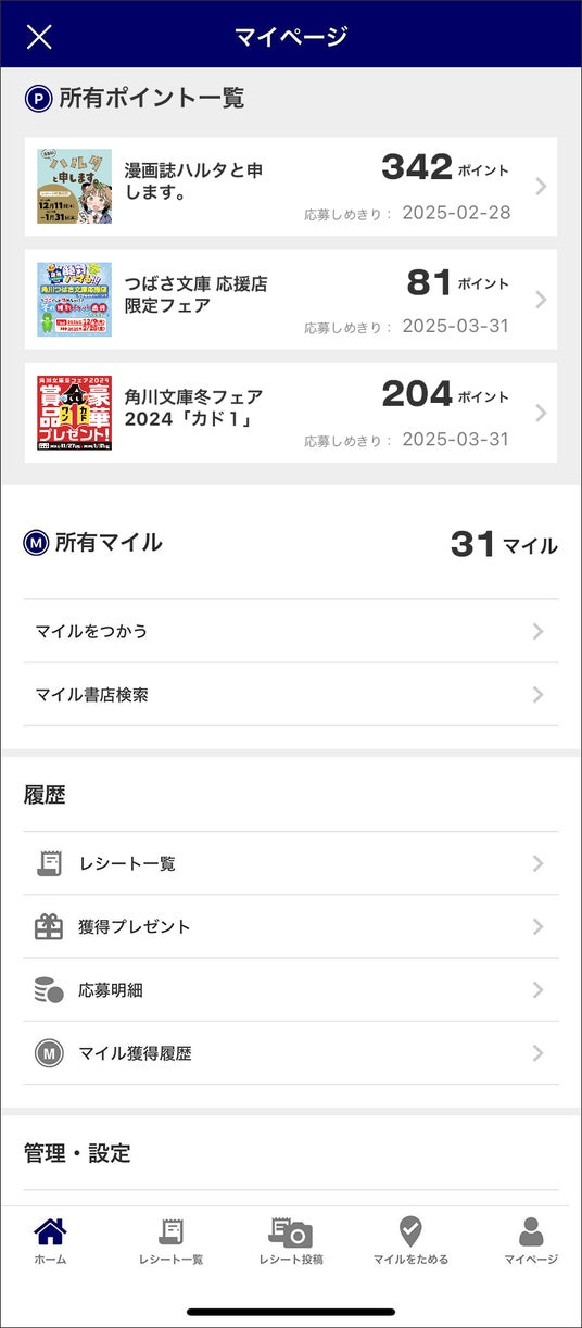 便利なマイページを新設しました。キャンペーンごとの所有ポイント数や所有マイル数を簡単に確認できるほか、所有ポイントがあるキャンペーンの応募しめきりが近づくと、アラートが表示されるようになりました。この機能により、応募忘れを防ぎます。