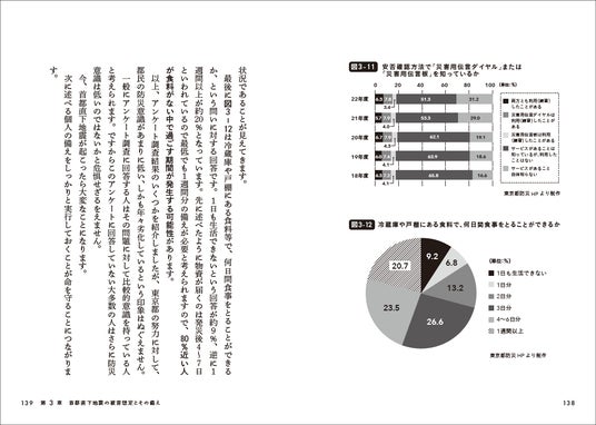 - 帰宅困難者対策として、職場や学校での備蓄品リストや避難計画も紹介しています。