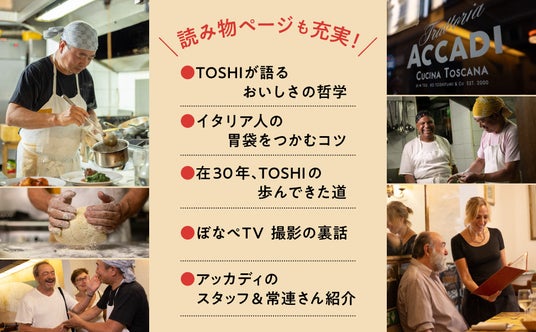 そしてこの度、「ぼなぺTV」「TOSHI」の共著により、待望のレシピ本を刊行することとなりました。「ぼなぺTV」が、イタリアで愛されるアッカディの魅力を紹介し、オーナーシェフTOSHIがその絶賛メニューのレシピを丁寧に教えます。