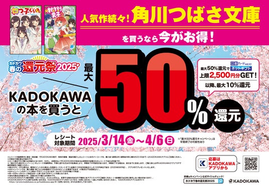 書店で本を買うと最大50%還元でオトクに買える『カドカワ春の還元祭2025』も本日14日から、全国書店で開催中!