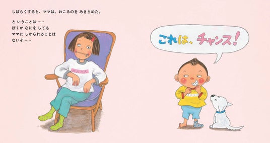 そしたら本当に、ママのおくちにチャックがついちゃった! しかも、おころうとすると、動けなくなるみたい。……ということは、ぼくがなにをしても、ママにしかられることはないぞ。