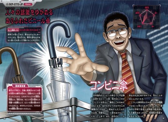 本書では、「SCP財団」に投稿された記事の中から、小学生人気の高い「シャイガイ」や「彫刻」はもちろん、ビニール傘に対する認識がゆがめられてしまう「コンビニ傘」や、アナウンスで名前を呼ばれた知り合いから、自分のことを忘れられてしまう「孤独な放送室」など、全33記事を人気マンガ家・イラストレーターによる迫力満点のマンガとイラストで紹介しています。